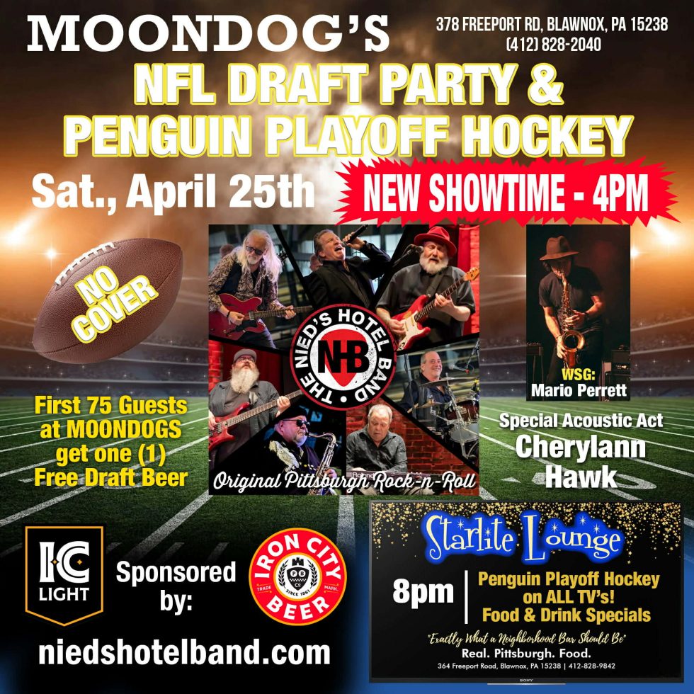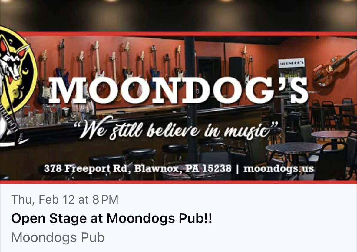 Join us for Open Stage at Moondogs Pub every other Thursday at 8:00 pm. We are always looking for new talent to play at Moondogs and the Pittsburgh Shrine Center. Come show us what you got!! NO COVER CHARGE!!