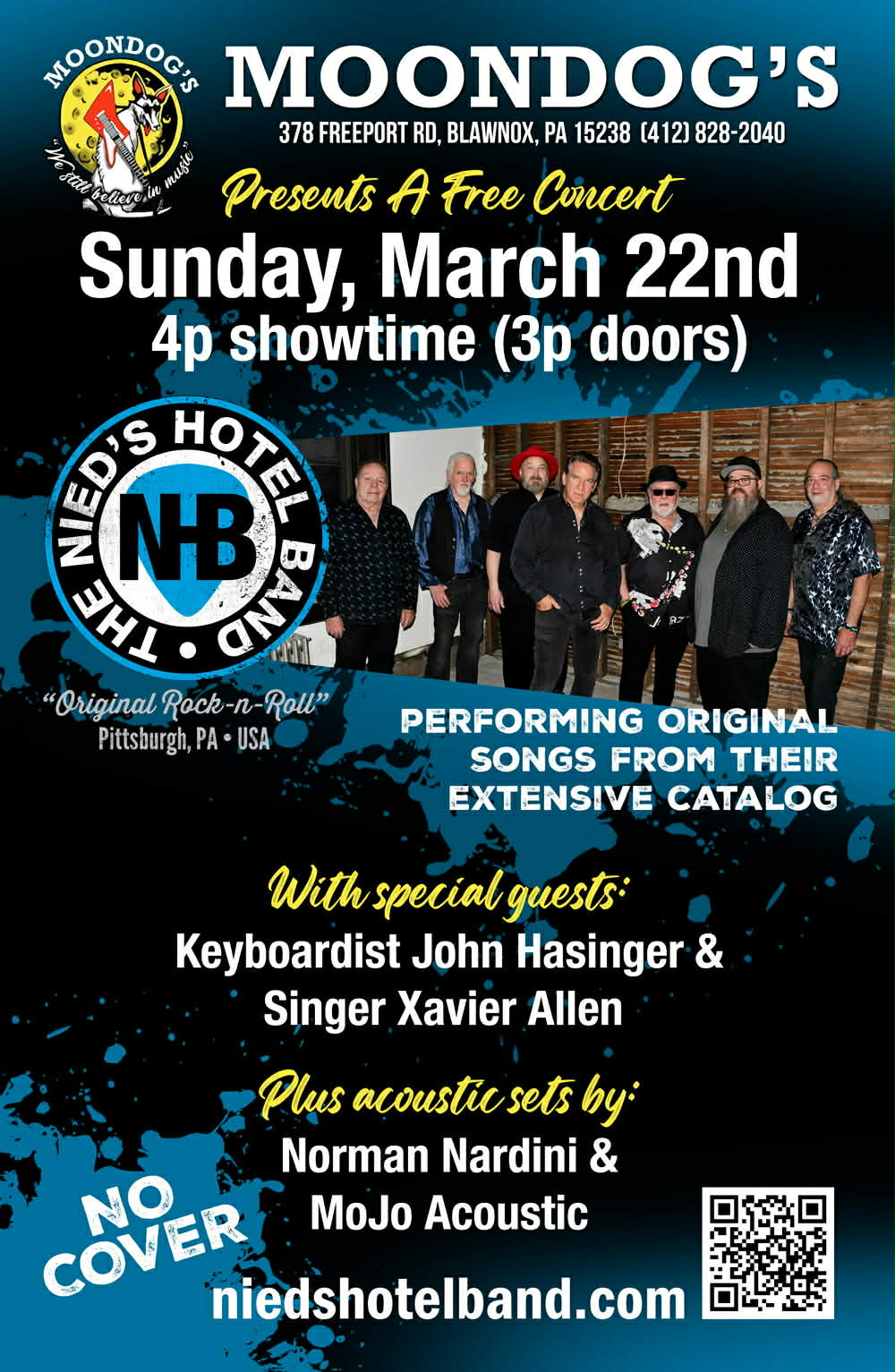 Moondogs Presents a Free Concert w/Nied’s Hotel Band, John Hasinger, Xavier Allen, Norman Nardini & MoJo Acoustic!!