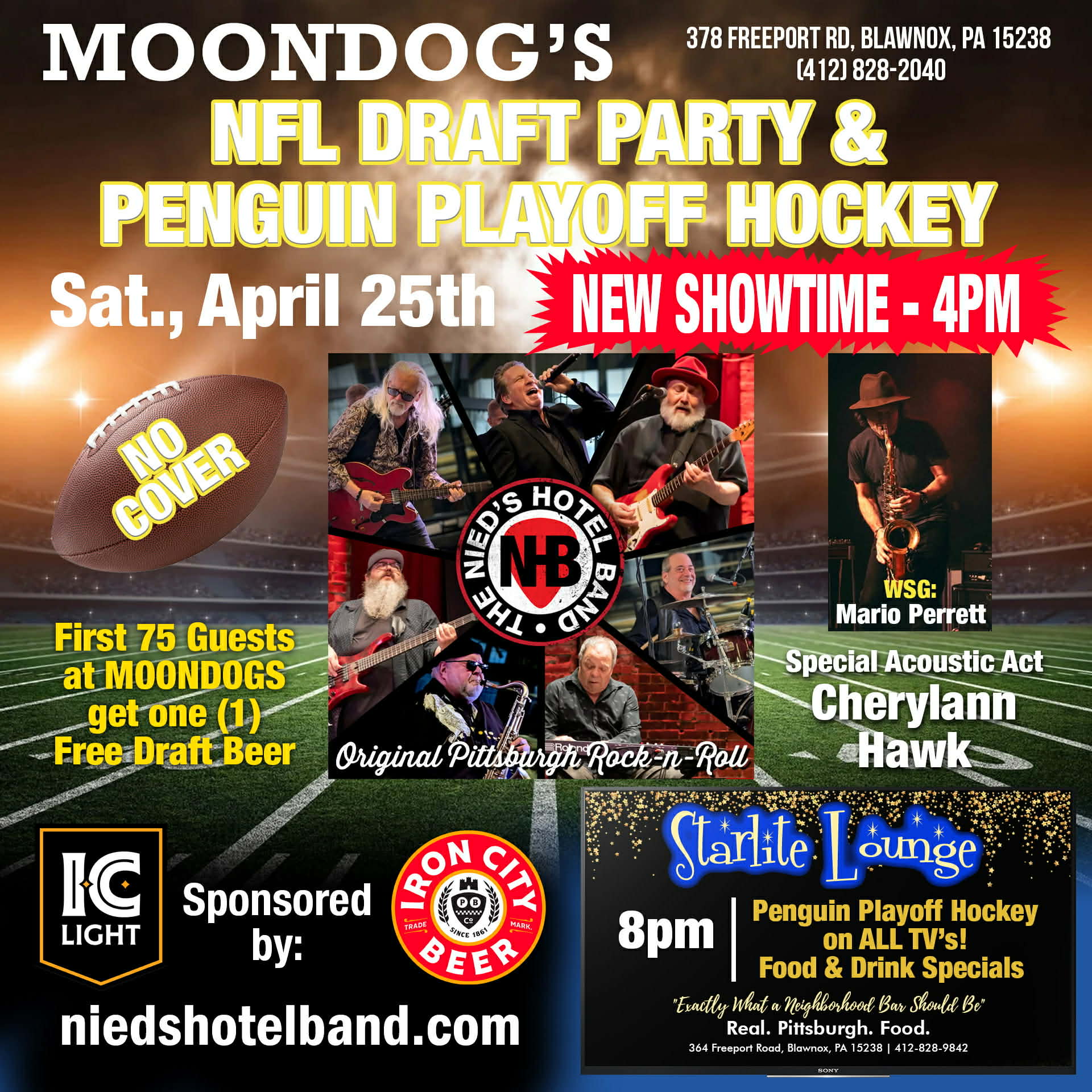 NFL Draft Party w/Nied’s Hotel Band, Special Guest, Mario Perett and Special Acoustic Act by Cherylann Hawk!!